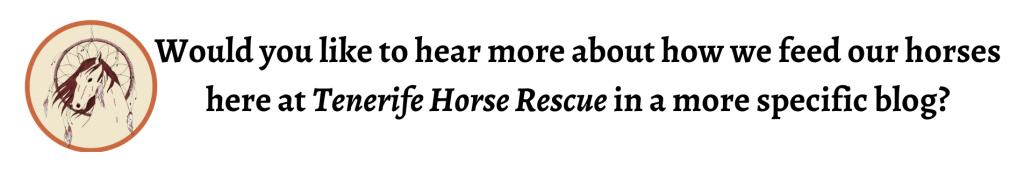 “Here we have our horses on a very natural and grain-free diet. As our horses are retired from competitive lives and they most are in light exercise, we give good quality roughage to form their diets. Unfortunately, being on a volcanic island comes with its difficulties and a price tag to get quality as everything comes from the mainland. For this, we have to add along with our hay pellet forms of forage such as alfalfa and hay cobs to get sufficient calorie intake and nutrients. Always access to fresh water and a mineral/salt lick is a priority for us as well because here we are advocates of barefoot horses our diet also reflects this. A diet that is too unnatural for the horse (full of cereals and additives) will not promote optimum foot health, which is essential for our horses here at Tenerife Horse Rescue on the harsh terrain. Emma, owner of Tenerife Horse Rescue