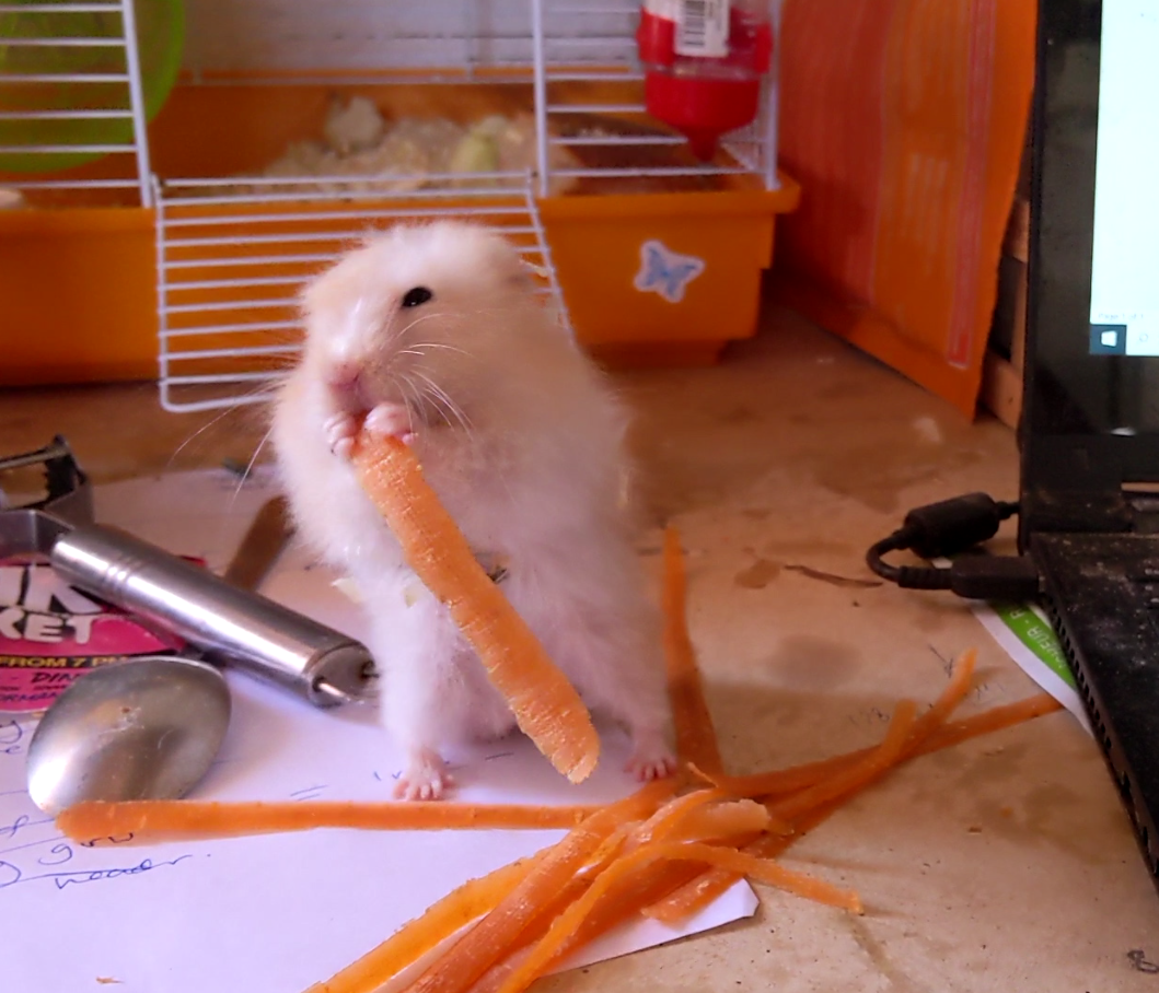 Running to people and begging for food, stealing it, hiding it and coming back for more. Confident and happy as a hamster could be. He passed away peacefully at the old age of around 5 years old. ( so we were told ) He had been with the previous owners for 2 1/2 years already a second owner. He then lived at the finca for over a year.