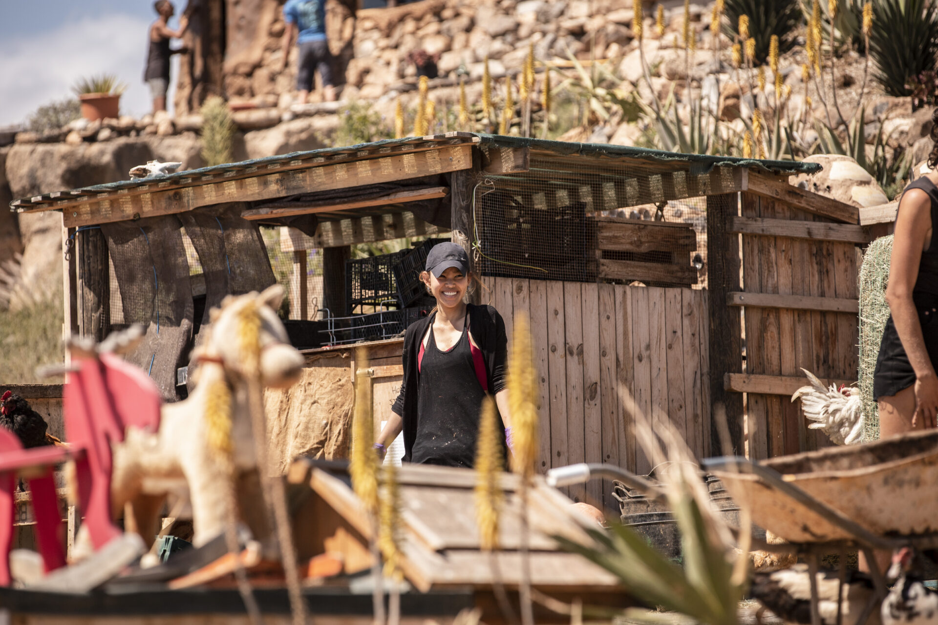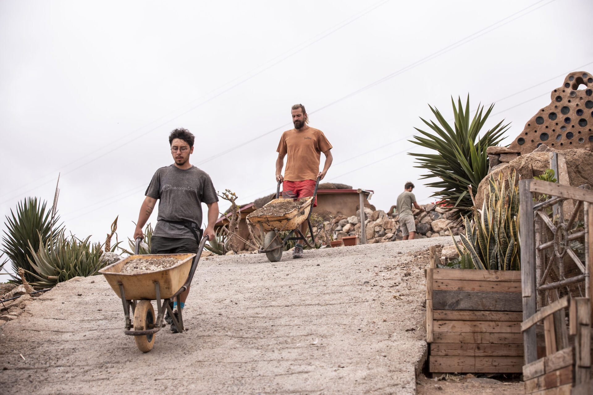 People who come here share our values and don’t mind staying in caravans, caves, huts, or whatever space is available. You might have to walk a bit to get to the next bathroom, live with dust, or light a candle in your cave at night — but we all love our basic, charming cave life. Have a look at our Finca Live Episode on YouTube to see more about how we live.