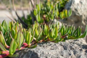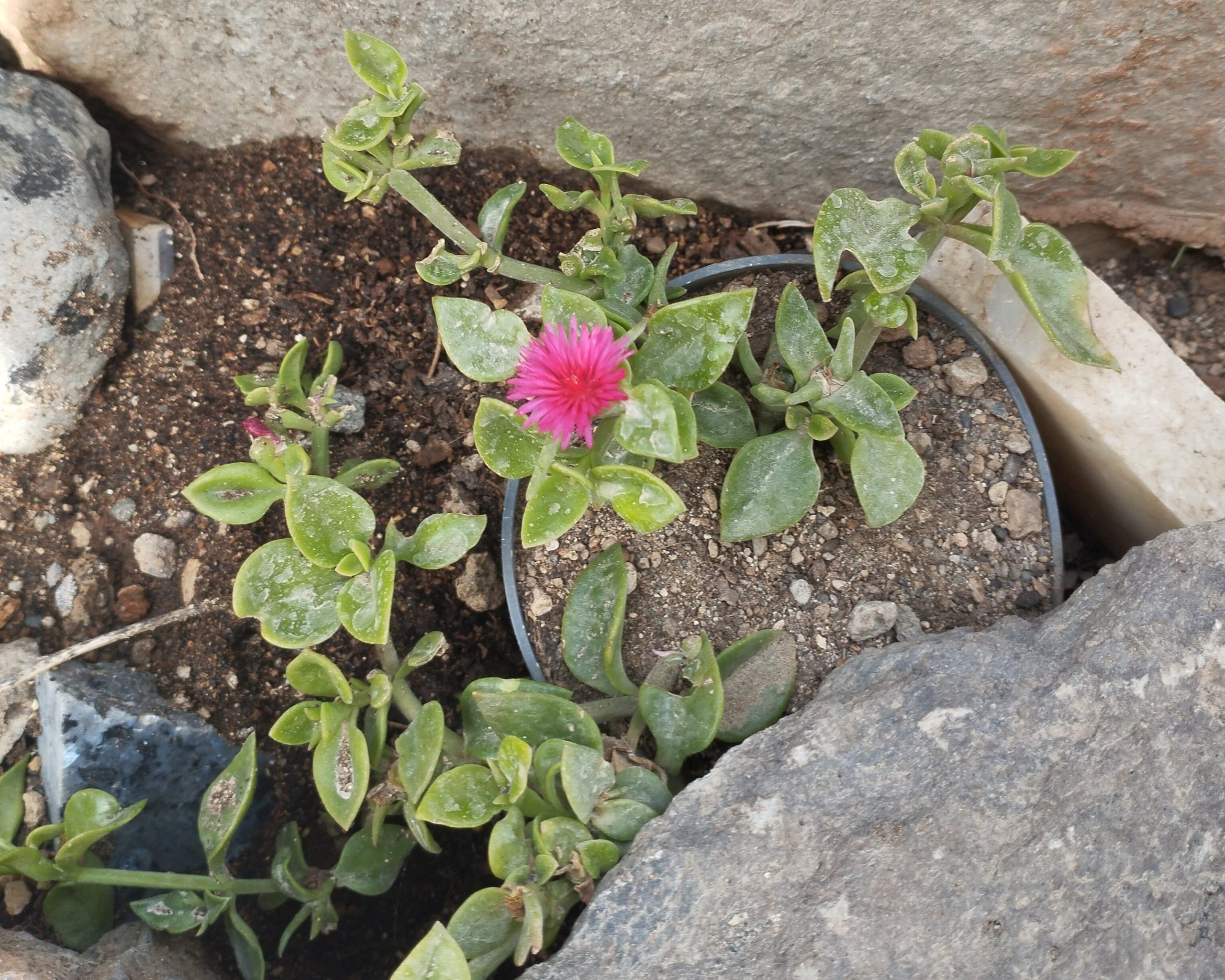 For some areas we planted Carpobrotus edulis as the first plant because we needed to get the soil green fast, then we left the plant dry out in the dry season. We left the dry cover on the ground to keep the soil protected and then we made some holes in this cover and planted Delospermum sp. in there. When the last one grows, we will plant trees. It’s like following an ecological succession.