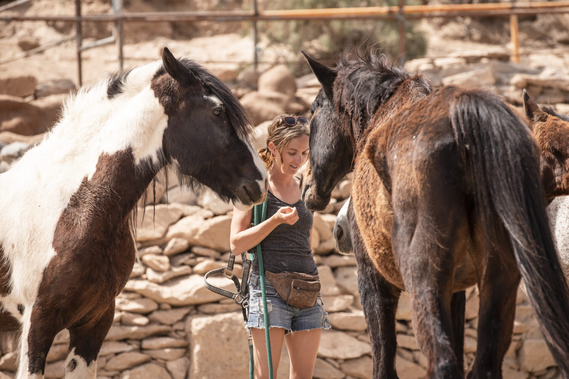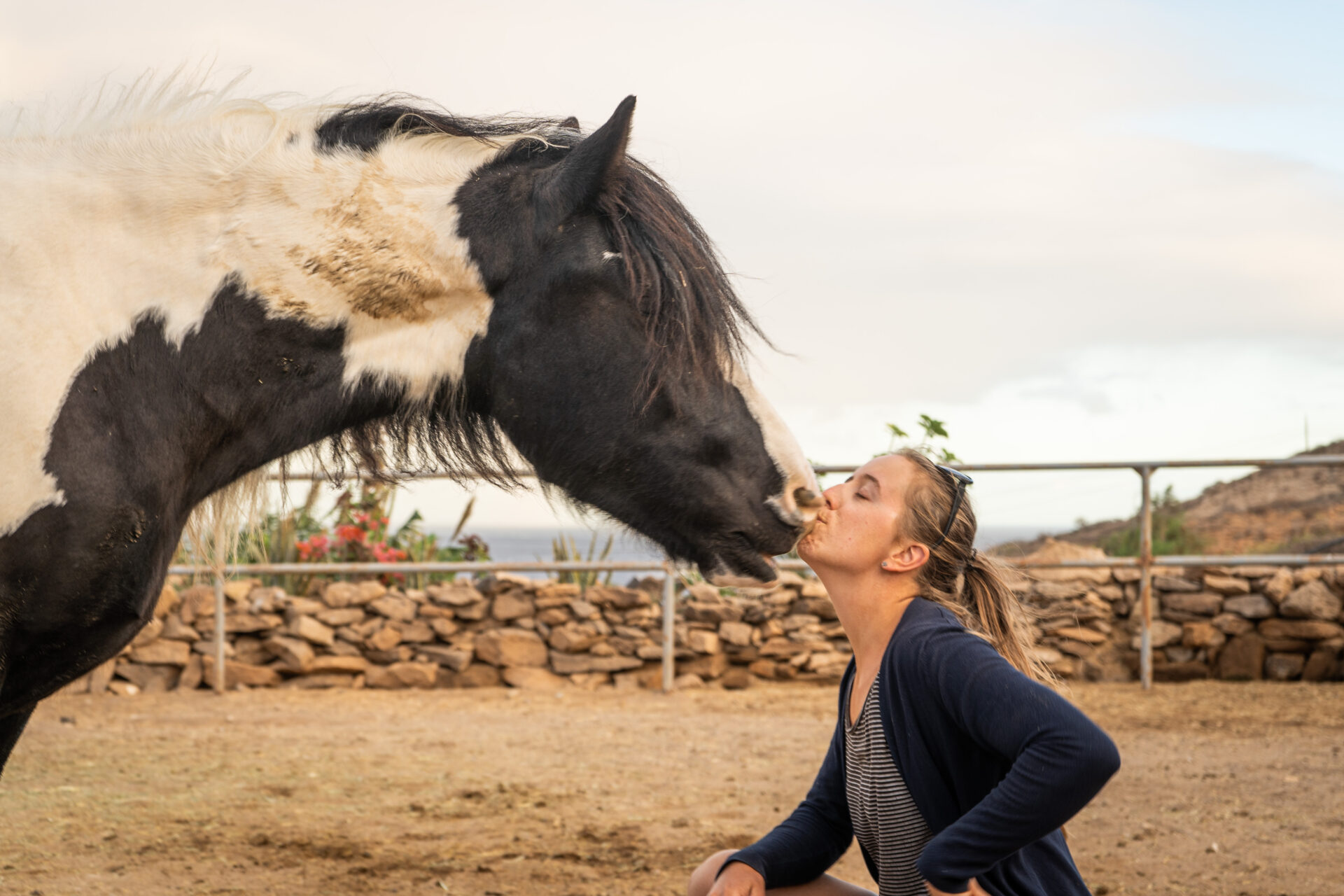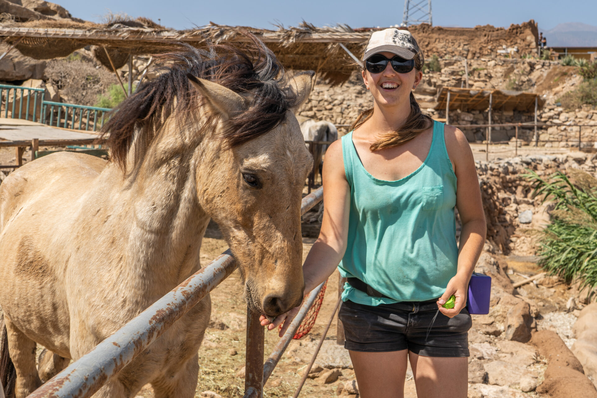 Mitzi, one of our volunteers from the Netherlands, is one of those people who just knows how to be with horses. She is kind, patient, and has wisely realized that animals can be better company than humans! Despite spending her days poo picking, grooming and training horses, she will often also choose to spend her time off with our cast of four-legged characters– and they’re always happy to hang out with her. Recently I spent time with Mitzi learning how to train a horse using positive reinforcement, which is a more intuitive way of communicating with the animals using reward systems for good behaviour. The method is strongly backed up by science, and the best part is that the animals love it.